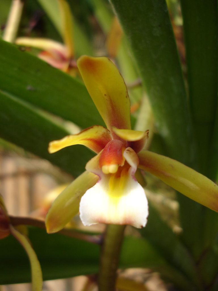 インド、スリランカ、ネパール、中国雲南からジャワ島に分布し、標高100~1000mの疎林地または河川流域の岩に着生する。球茎が小さく、高さ3~6cm。葉は革質で4~5枚、帯状、やや湾曲する。長さ40~90cm、幅1.5~4cm。先端部分に丸い切り込みが不均等に入るか2裂する。花茎は球茎の基部から抽出し、下垂、長さ20~60cm、20~35花を総状花序につける。花色は個体による変化がある。花はやや小さめ、かすかな芳香がある。花弁と萼片は淡い黄色い~バターのような黄色い。中央に一本の栗褐色の帯と数本の筋が入る。萼片は楕円形、長さ1.5~2cm、幅0.4~0.6cm。唇弁は卵形、長さ1.3~2cm、3裂し、白色~黄色い、栗褐色の筋が密に入る。蕊柱は長さ1~1.2cm、前のほうにやや湾曲する。花粉塊は2個。開花期は4~5月であるが、まれに10月にも開花する。栽培は容易。