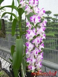 原產於菲律賓民答那峨島。葉革質,長約20~30cm,寬約4~5cm。花序長約30~40cm,密生多數的花,花朵直徑約4cm。花肉厚,蠟質,散發出香氣。典型的花為白色帶有紅紫色斑。花期秋季。